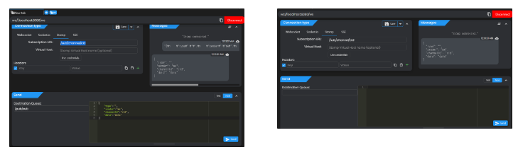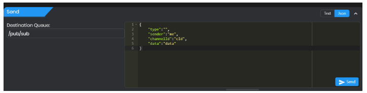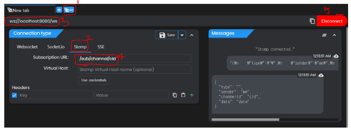 - ws://localhost:8080/ws - 연결할 링크 (소켓이므로 http 대신 ws, 코드에서 설정한 endpoint가 ws이므로 마지막 ws로 끝남)
