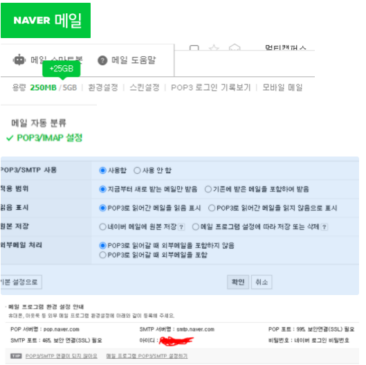 네이버 메일 → 환경설정 → POP3/IMAP 설정 - POP3/SMTP 사용 사용함 설정
