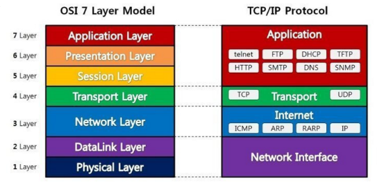 - 네트워크에서 통신이 일어나는 과정을 7단계로 나눈 것